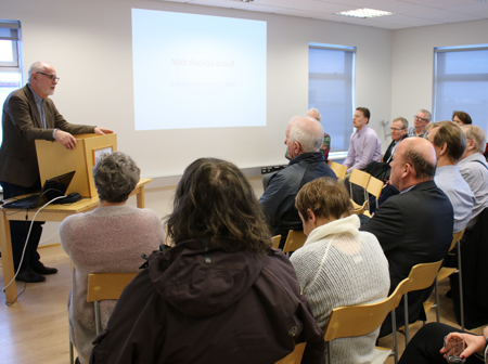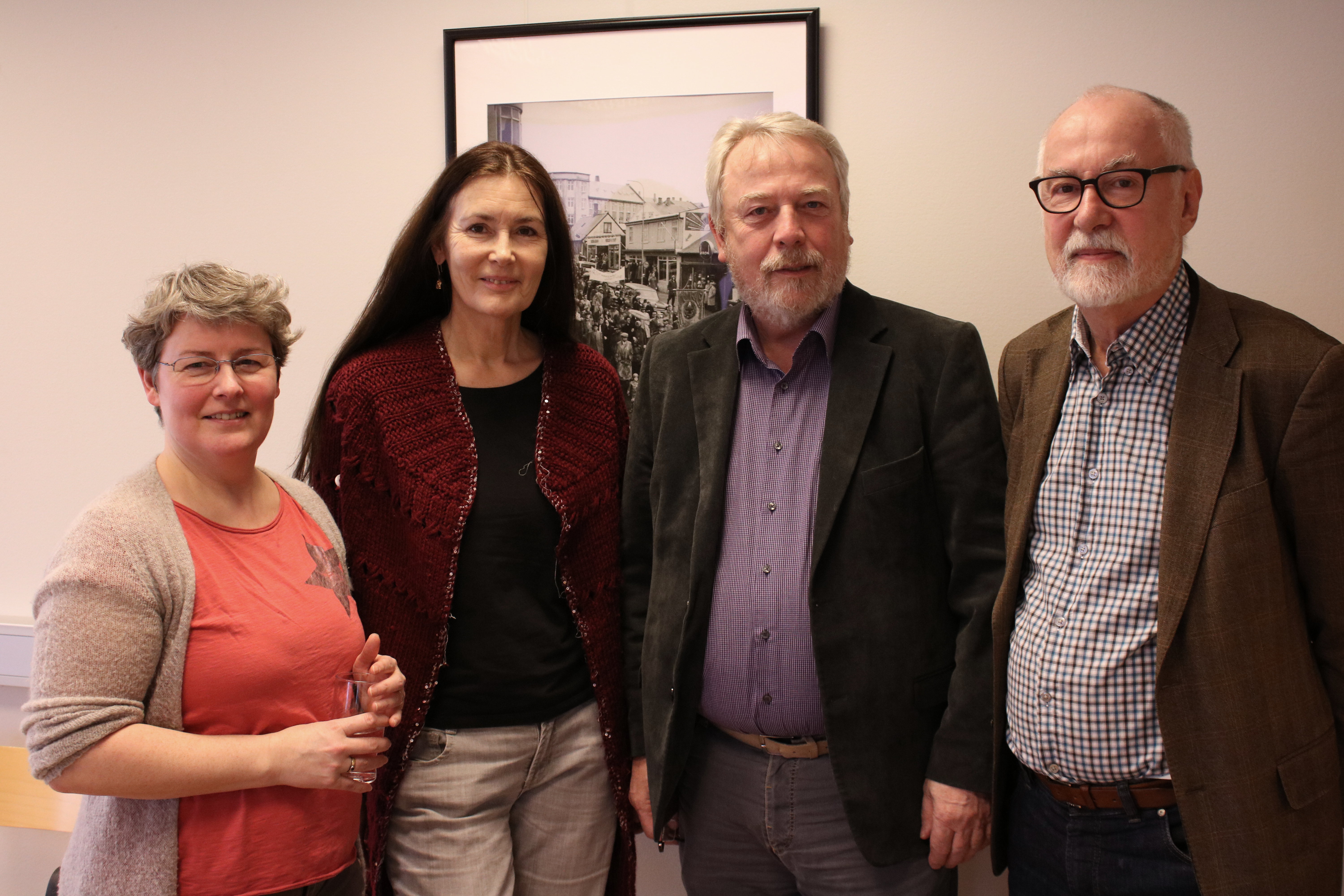Það var sérlega fræðandi og áhugaverður fyrirlesturinn sem Guðjón Friðriksson sagnfræðingur flutti á 60 ára afmæli Bókasafns Dagsbrúnar 26. janúar sl. Í fyrirlestrinum sem bar yfirskriftina „Vort daglegt brauð“ : Alþýðubrauðgerðin í Reykjavík. Guðjón frá þessu merka fyrirtæki sem stofnað var af verkamönnum og sjómönnum í Reykjavík árið 1917 til að lækka verð á brauði og rekið af alþýðuhreyfingunni allt til ársins 1977.Í tilefni afmælis bókasafnsins var búið að endurprenta gamlar myndir úr myndasafni Eflingar sem áður tilheyrði Dagsbrún og hengu myndirnar uppi á veggjum gestunum til sýnis.Eftir fyrirlesturinn voru umræður og svo fengu gestir léttar veitingar í anda fyrirlestursins, snittur og brauðbollur.Að fyrirlestrinum stóðu auk Bókasafns Dagsbrúnar, Efling-stéttarfélag og ReykjavíkurAkademían.Bókasafn Dagsbrúnar var stofnað á 50 ára afmæli Verkamannafélagsins Dagsbrúnar þann 26. janúar 1956 þegar Guðrún Pálsdóttir, ekkja Héðins Valdimarssonar, gaf félaginu bókasafn manns síns til minningar um hann. Safnið var fyrst til húsa í félagsheimili múrara og rafvirkja að Freyjugötu 27 en var svo á ýmsum stöðum í Reykjavík þar til það flutti í húsakynni ReykjavíkurAkademíunnar árið 2003. Meginstofn safnsins eru bókagjafir úr einkasöfnum einstaklinga.Sesselja G. Magnúsdóttir, framkvæmdastjóri ReykjavíkurAkademíunnar, Ragnheiður Ólafsdóttir, verkefnastjóri fyrirlestursins, Sigurður Bessason, formaður Eflingar-stéttarfélags og Guðjón Friðriksson, sagnfræðingur, eftir fyrirlesturinn fyrir framan eina af myndunum sem var til sýnis.