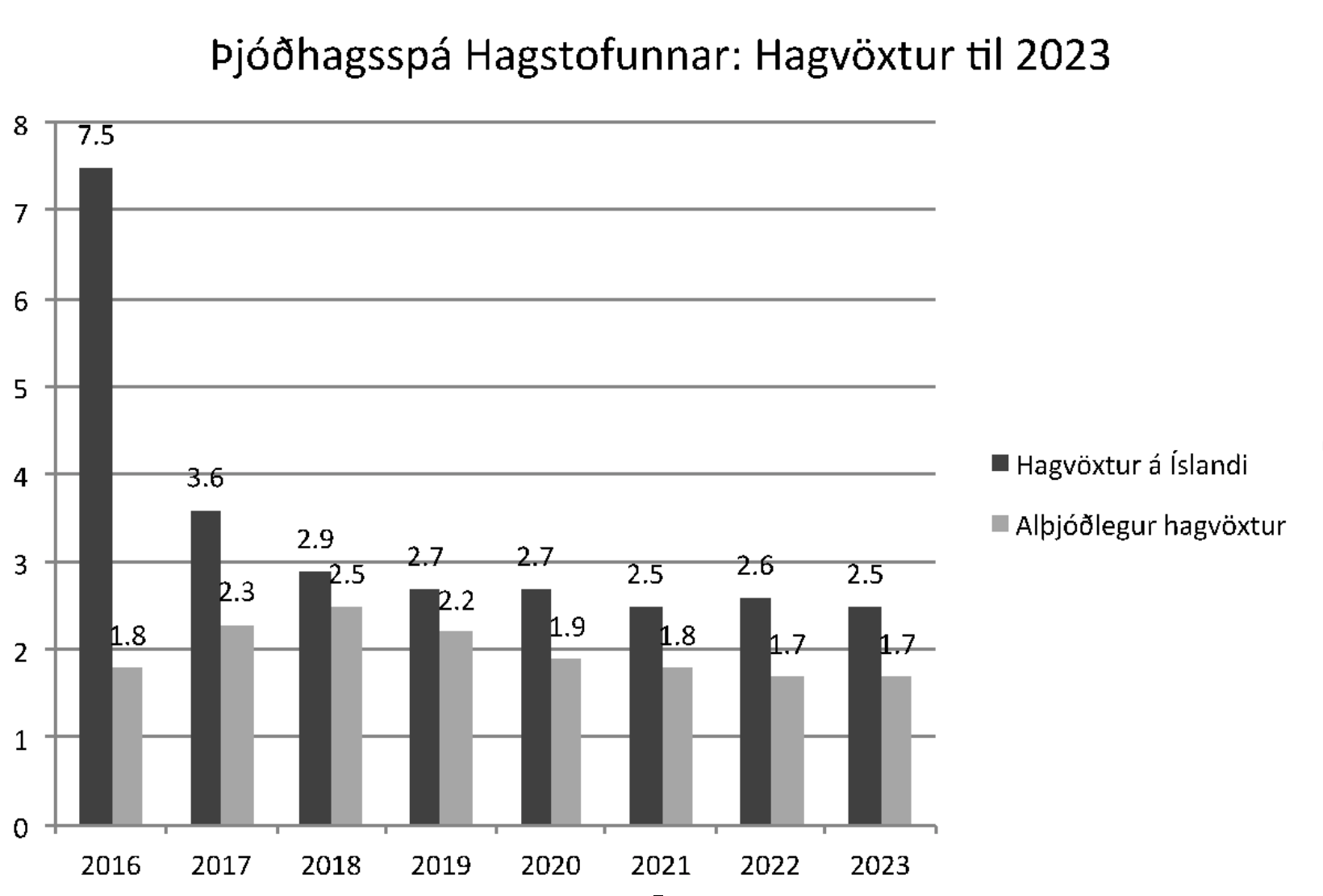 Hér er ágætur hagvöxtur. Mun meiri en almennt er í hagsældarríkjunum á Vesturlöndum. Þó eitthvað myndi hægja á þá væru Íslendingar áfram í góðum málum. Árið 2017 var hagvöxtur 3,6% á Íslandi en meðaltal Evrópusambandsríkja var 2,4%.