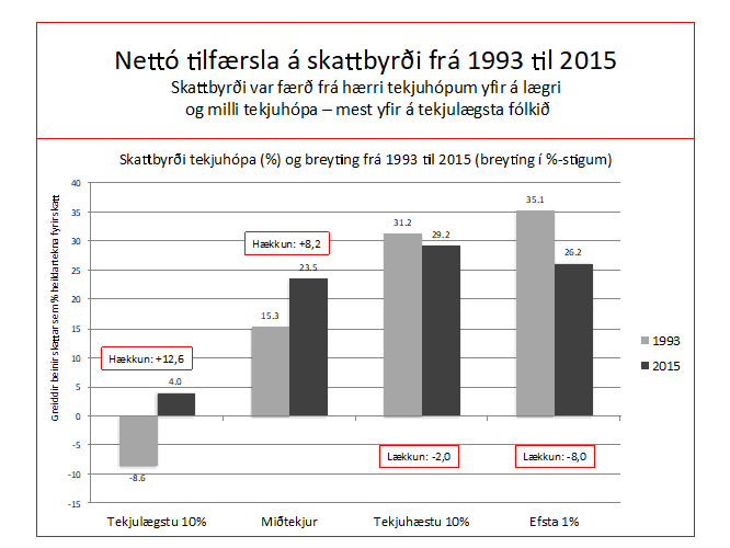 Stefán Ólafsson skrifar:Á síðustu 25 árum eða svo hafa stjórnvöld framkallað mikla tilfærslu á skattbyrði – af hærri tekjuhópum og yfir á þá lægri. Þetta hefur verið gert með ýmsum aðgerðum, sem eru skýrðar á ítarlegan hátt í nýlegri bók (Ójöfnuður á Íslandi, 2017) sem og í skýrslu ASÍ um skattbyrði launafólks 1998 til 2016. Rýrnun persónuafsláttar (skattleysismarka), upptaka fjármagnstekjuskatts (með mun lægri álagningu en er á atvinnutekjur) og rýrnun vaxta- og barnabóta sem dragast frá álögðum skatti koma þar mest við sögu.Þessi þróun hefur stórskaðað þann árangur sem lægra launað fólk átti að hafa af kjarasamningunum frá 2015 og reyndar einnig á fyrri árum. Þessi þróun hefur að auki verið afar óhagstæð fyrir lífeyrisþega. Mynd 1 sýnir umfang þessarar skattatilfærslu frá 1993 til 2015. Sýnd er skattbyrðin 1993 (% heildartekna sem greidd er í beina skatta) og svo aftur 2015, í fjórum tekjuhópum: lægstu tíu prósentin, miðtekjuhópur, efstu tíu prósentin og efsta eina prósentið. Í gluggum við súlurnar er sýnd nettó breytingin á tímabilinu í prósentustigum. Tilfærslan frá hærri hópum til þeirra lægri og miðtekjuhópa er skýr og umtalsverð.