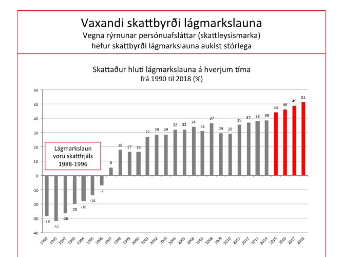 Lágmarkslaun og óskertur lífeyrir TR voru skattfrjáls frá 1988 til 1996. Síðan þá hefur vaxandi hluti lágmarkslauna verið skattlagður, frá 6% 1997 og upp í 37% árið 2008. Þá minnkaði skattaði hlutinn í tvö ár en tók svo aftur að stækka. Nú er meira en helmingur lágmarkslauna skattlagður að fullu (51%). Lituðu súlurnar til hægri sýna hvernig skattbyrði lágmarkslauna hækkaði afgerandi frá 2015 til 2018, sem er tímabil gildandi kjarasamnings á vinnumarkaði. Í samningnum 2015 var samið um umtalsverðar hækkanir lágmarkslauna, en vegna þess að persónuafslátturinn fylgdi ekki launaþróuninni þá jókst skattbyrði lágmarkslaunanna umtalsvert.Með þessu og einnig með því að rýra verulega vaxtabætur og barnabætur (sem dragast frá álögðum skatti láglaunafólks) þá tók hið opinbera í reynd drjúgan hluta af umsömdum kjarabótum fyrir láglaunafólk (sjá skýrslu ASÍ um skattbyrði launafólks 2016 og skýrslu Gylfa Zoega fyrir forsætisráðuneytið 2018). Þetta er auðvitað óþolandi niðurstaða fyrir verkalýðshreyfinguna og meðlimi hennar. En þetta er bara enn einn kaflinn í þessari lengri tíma sögu um tilflutning skattbyrðarinnar frá hærri tekjuhópum til lægri og milli hópa.