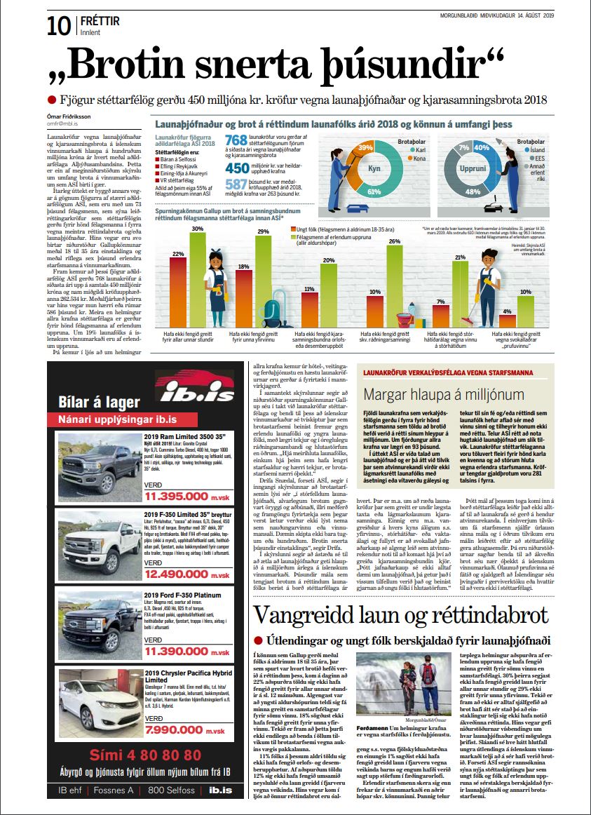 Undanfarin ár hefur verið hraður vöxtur í efnahagslífinu á Íslandi. Ný rannsókn ASÍ, sem byggir á skoðanakönnunum og launakröfum stéttarfélaga, bendir til að samhliða þessari þróun hafi jaðarsetning og brotastarfsemi aukist á íslenskum vinnumarkaði. Stéttarfélög fá inn á borð til sín fleiri og alvarlegri mál en áður tengd launaþjófnaði og kjarasamningsbrotum. Brotin virðast einkum beinast gegn hópum sem síður þekkja rétt sinn, þ.e. erlendu launafólki, ungu fólki og einstaklingum með lágar tekjur. Við þessum brotum eru í dag engin viðurlög sem Alþýðusambandið telur algerlega óásættanlegt.Helstu niðurstöður rannsóknarinnar eru eftirfarandi:• Launakröfur vegna launaþjófnaðar og kjarasamningsbrota hlaupa á hundruðum milljóna króna á ári.• Fjögur aðildarfélög ASÍ gerðu 768 launakröfur árið 2018 upp á samtals 450 milljónir króna og nam miðgildi kröfuupphæðar 262.534 kr.• Meira en helmingur allra krafna stéttarfélaga eru gerðar fyrir hönd félagsmanna af erlendum uppruna. Um 19% launafólks á íslenskum vinnumarkaði er af erlendum uppruna.• Um helmingur allra krafna kemur úr hótel-, veitinga- og ferðaþjónustu en hæstu launakröfurnar eru gerðar á fyrirtæki í mannvirkjagerð.• Niðurstöður spurningakönnunar Gallup eru í takt við launakröfur stéttarfélaga og benda til þess að brotastarfsemi beinist fremur gegn erlendu launafólki og yngra fólki, með lægri tekjur og í óreglulegu ráðningarsambandi og hlutastörfum.• Skoðun á launakröfum og spurningakönnunin benda til að brotin felist m.a. í vangreiðslum á launum, álagsgreiðslum og ýmsum réttindabrotum.• Hjá meirihluta launafólks, einkum hjá þeim sem hafa lengri starfsaldur og hærri tekjur, er brotastarfsemi nærri óþekkt.Brotastarfsemi gagnvart erlendu launafólki og ungmennum er alvarleg meinsemd á íslenskum vinnumarkaði sem uppræta verður með öllum tiltækum ráðum. Dæmin skipta ekki bara tugum eða hundruðum. Brotin snerta þúsundir einstaklinga. Þessir félagar okkar eiga að njóta kjara og annarra réttinda til jafns við aðra á vinnumarkaði. Það eru hagsmunir samfélagsins alls. Hér er ábyrgð stjórnvalda og samtaka atvinnurekenda mikil.• Bæta þarf löggjöf og regluverk. Lögbinda verður hörð viðurlög og sektargreiðslur vegna launaþjófnaðar og annarra brota gegn launafólki• Efla þarf upplýsingamiðlun, eftirlit á vinnumarkaði og eftirfylgni vegna brotastarfsemi. Bæta með kerfisbundnum hætti samstarf og samvinnu stjórnvaldsstofnana og aðila vinnumarkaðarins með samræmdri og öflugri upplýsingamiðlun.• Stuðningur við brotaþola. Tryggja verður að þeir einstaklingar sem brotið er á sæki rétt sinn með stuðningi verkalýðshreyfingarinnar og samfélagsins alls og þeir njóti öryggis og skjóls.Í tengslum við gerð kjarasamninga vorið 2019 gaf ríkisstjórn Íslands fyrirheit um að gripið verði til fjölmargra aðgerða gegn launaþjófnaði og brotastarfsemi á vinnumarkaði. Fyrirheit sem byggja á kröfum og áherslum verkalýðshreyfingarinnar. Fyrir liggur aðgerðaáætlun en verkefnið nú er að fylgja yfirlýsingunni eftir og hrinda að fullu í framkvæmd á næstu mánuðum þannig að stigin verði markviss og afgerandi skref til að uppræta brotastarfsemi á vinnumarkaði.ÍSLENSKUR VINNUMARKAÐUR 2019 – Erlent launafólk og brotastarfsemi á vinnumarkaði (skýrslan í heild sinni)Umfjöllun í Morgunblaðinu 14.98.2019