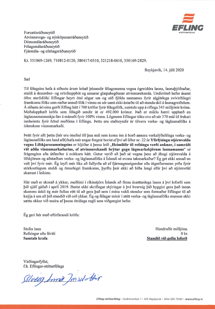 Formaður Eflingar, Sólveig Anna Jónsdóttir, sendi í dag bréf á fulltrúa ríkisstjórnarinnar þar sem þess er krafist að staðið sé við loforð gefin í apríl í fyrra um viðurlög við kjarasamningsbrotum. Skeytið er í formi kröfubréfs, áþekku þeim 700 sem send eru frá félaginu árlega vegna kjarasamningsbrota atvinnurekenda. Loforð stjórnvalda hefur legið sofandi í nefnd svo mánuðum skiptir.„Getur verið að það sé vegna þess að áhugi stjórnvalda á lífskjörum og aðstæðum verka- og láglaunafólks á Íslandi sé svona takmarkaður?“ spyr Sólveig í bréfinu. „Ég leyfi mér líka að fullyrða að ef fjármagnseigendur eða útgerðarmenn yrðu fyrir stórkostlegum stuldi og ömurlegri framkomu, þyrftu þeir ekki að bíða lengi eftir því að stjórnvöld skærust í leikinn.“Í bréfinu er farið fram á að skrifleg svör verði veitt um hvernig loforðið verði uppfyllt. Ef þau berist ekki „áskil ég mér fullan rétt til að gera það sem í mínu valdi stendur sem formaður Eflingar til að knýja á um að þið standið við orð ykkar.“