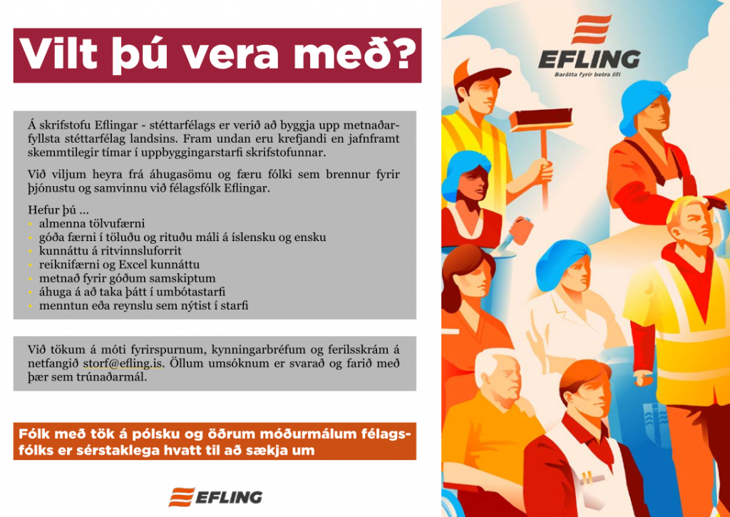 Við viljum heyra frá áhugasömu og færu fólki sem brennur fyrir þjónustu og samvinnu við félagsfólk Eflingar.