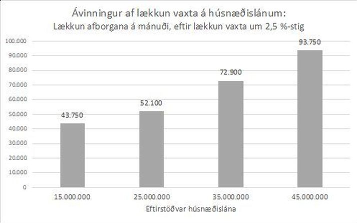 Það er vegna þess að tekjuhærri heimili hafa alla jafna hærri húsnæðisskuldir og þeir sem skulda meira munu njóta meiri lækkunar afborgana með lækkun vaxta. Sem dæmi má nefna að heimili sem skuldar 25 milljóna í óverðtryggt húsnæðislán myndi fá lækkun afborgana um 52 þúsund á mánuði þegar vextir hafa lækkað um 2,5% stig. Ávinningur þeirra sem eru með verðtryggð lán verður svipaður en skilar sér að hluta með öðrum hætti. Þeir sem skulda 45 milljónir fá mun meiri lækkun afborgana.