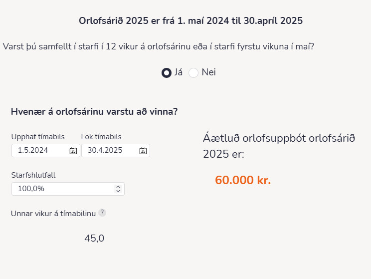 Á vef Eflingar stéttarfélags er nú aðgengileg reiknivél sem gerir félagsfólki kleift að reikna út orlofsuppbót sína á einfaldan og skjótan máta. Hægt er að stilla reiknivélina eftir mismunandi kjarasamningum, þar á meðal kjarasamningum fyrir almenna vinnumarkaðinn (SA), hótel og veitingahús, Reykjavíkurborg, ríkið, önnur sveitarfélög sem og hjúkrunarheimili (SFV). Upphæðin er reiknuð miðað við orlofsárið 2025, sem nær frá 1. maí 2024 til 30. apríl 2025.