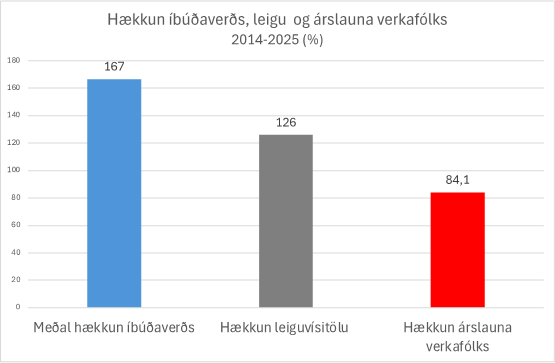 Íbúðaverð og leiga hafa hækkað langt umfram árslaun verkafólks (sjá meðfylgjandi mynd). Þannig grefur ástand húsnæðismálanna stórlega undan möguleikum launafólks á að koma sér upp íbúðarhúsnæði og rýrir kaupmátt. Það leggst með mestum þunga á fólk í lægri tekjuhópum. Húsnæðisstuðningur við heimilin hefur verið of ómarkviss, að mati HMS.