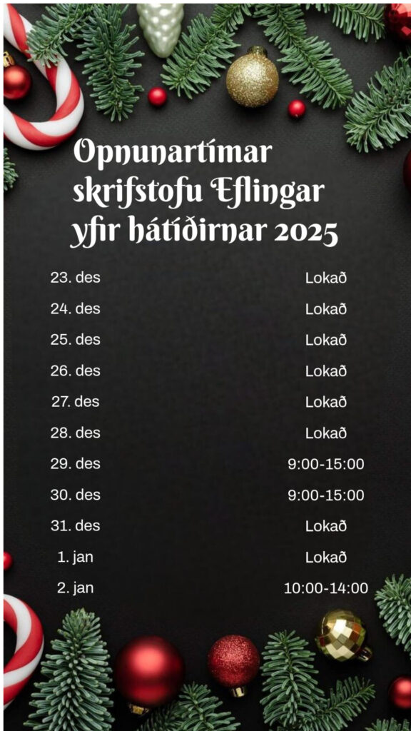Skrifstofa Eflingar stéttarfélags verður lokuð 23. desember, á Þorláksmessu. Skrifstofan opnar aftur 29. desember, á hefðbundnum tíma klukkan 9:00. Opið er þann dag og 30. desember en lokað á gamlársdag 31. desember.