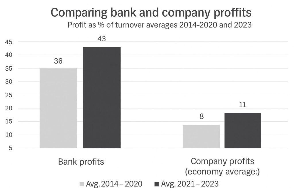 For comparison, the profit share of the fishing industry is around 20 per cent in good years. Retail, including supermarkets, is at about 6 per cent and construction companies at around 10 per cent, against the banks’ 43 per cent. Banks are therefore operating in an entirely different world from the rest of society.