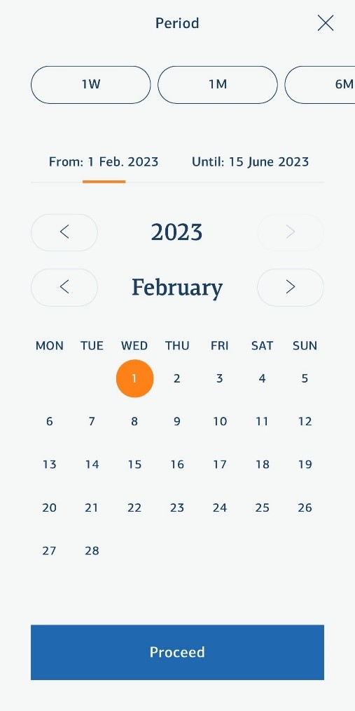 - Then press the line where you see Period and select the date. You need the select the month by pressing on the arrows, you also must press the date to update it. Lastly press proceed.