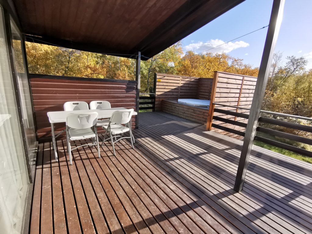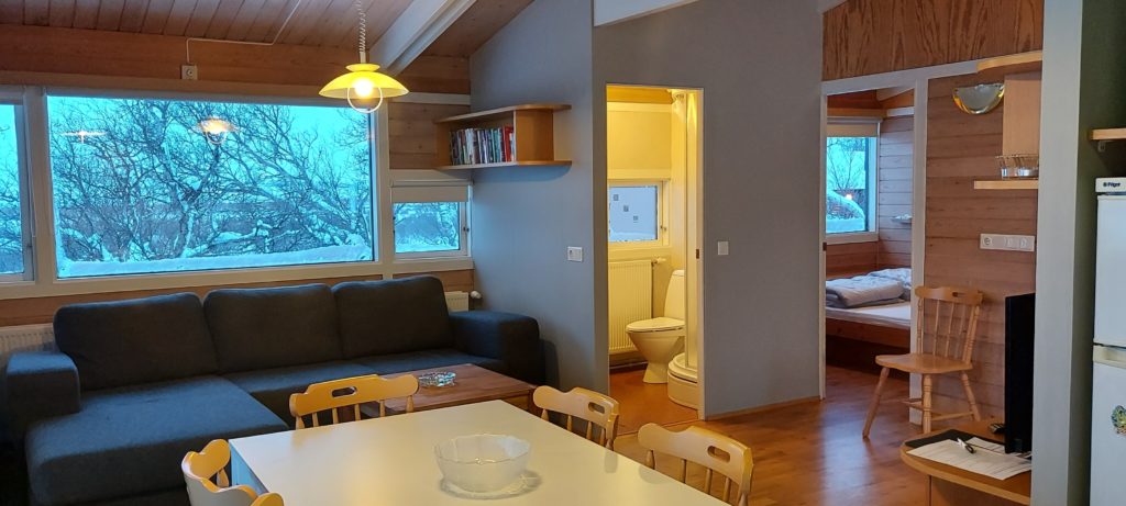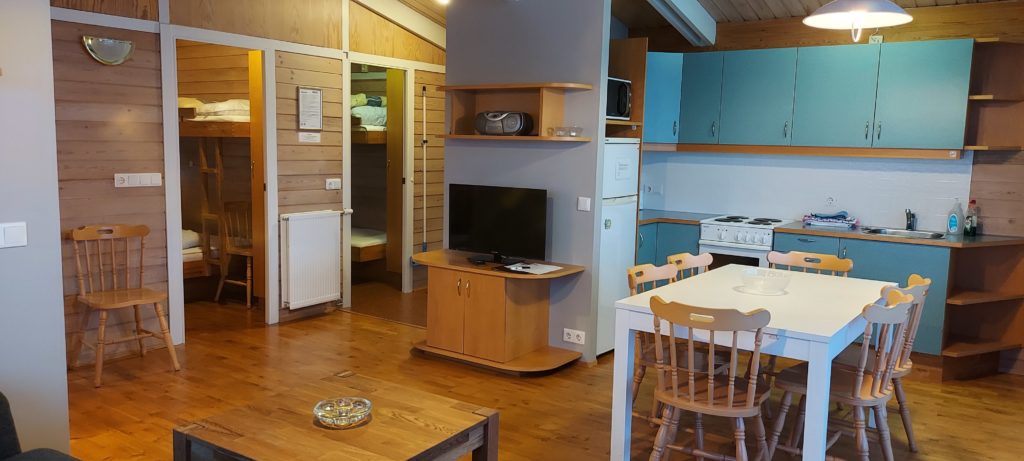 The houses have three bedrooms, one double bedroom and two bunk rooms. Sofa bed in living room. Living room, kitchen common and dining area. Bathroom with shower. Sleeps seven. Duvets for seven people. All main equipment is included. TV, radio, fridge, stove, microwave and gas grill. Also everything needed for cleaning.