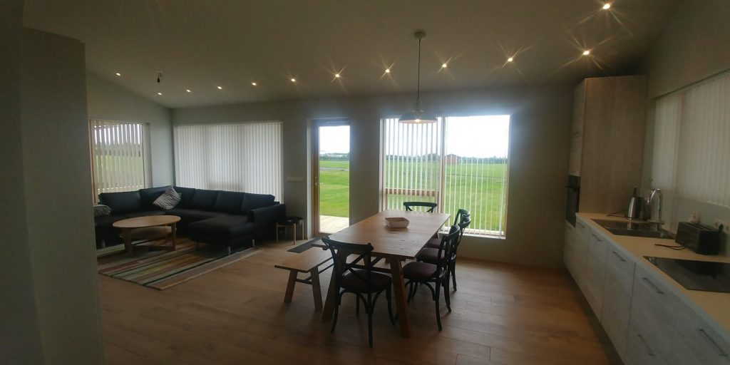 The house is in the holiday and leisure area of Hellishólar in Fljótshlíð. It is approx. 110 sqm, with four bedrooms, living room, dining room and kitchen. Bathroom is with a washing machine and a dryer. The house accomodates 8 people with two 90 cm beds in each room, duvet for 8 people. The living room and kitchen are in a shared space with a stove, refrigerator, dishwasher and microwave. Spacious living room with a TV. There is a patio at the house with outdoor furniture and gas barbecue, not a hot tub. All cleaning products and utensils are provided.