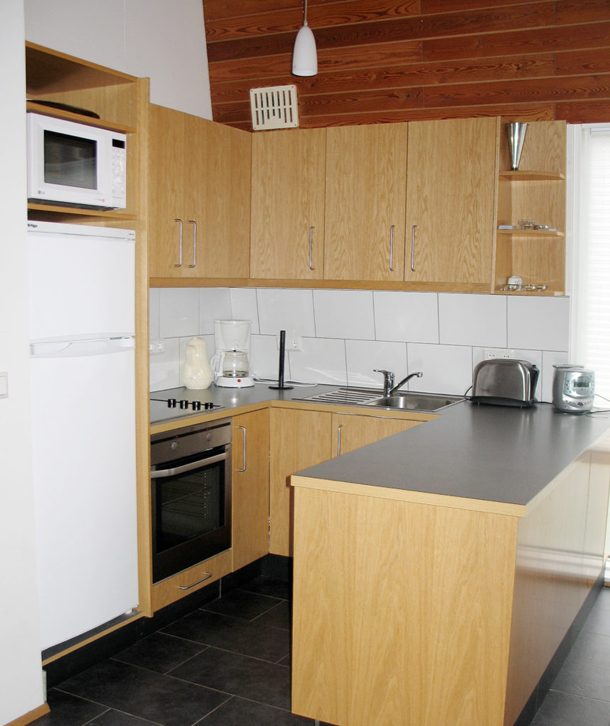 Í húsunum eru þrjú svefnherbergi, þar af eitt hjónaherbergi með tvíbreiðu rúmi og tvö kojuherbergi með einbreiðum rúmum. Svefnstæði og sængur og koddar fyrir sex manns. Stofa og eldhús í sameiginlegu rými og sólskáli. Baðherbergi með sturtu. Allur helsti útbúnaður fylgir s.s. sjónvarp, ísskápur, eldavél, örbylgjuofn og gasgrill. Einnig öll ræstiefni og áhöld.