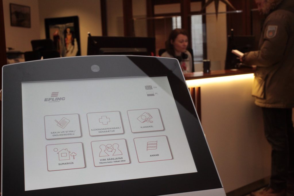 Wczoraj, w recepcji Eflingu, uruchomiony został system obsługi Kiosk. Celem systemu jest ulepszenie obsługi członków związku, skrócenie czasu oczekiwania i usprawnienie wszelkich usług.Z okazji uruchomienia systemu Sólveig Anna, przewodnicząca, Agnieszka Ewa, wiceprzewodnicząca, i Ingibjörg Ólafsdóttir, szefowa działu obsługi klienta, spotkały pierwszego członka, który przyszedł do naszgeo biura po uruchomieniu systemu. Pokazały mu one jak obsługiwać system i wręczyły mu bukiet kwiatów. Zapraszamy wszystkich serdecznie do biura Eflingu!