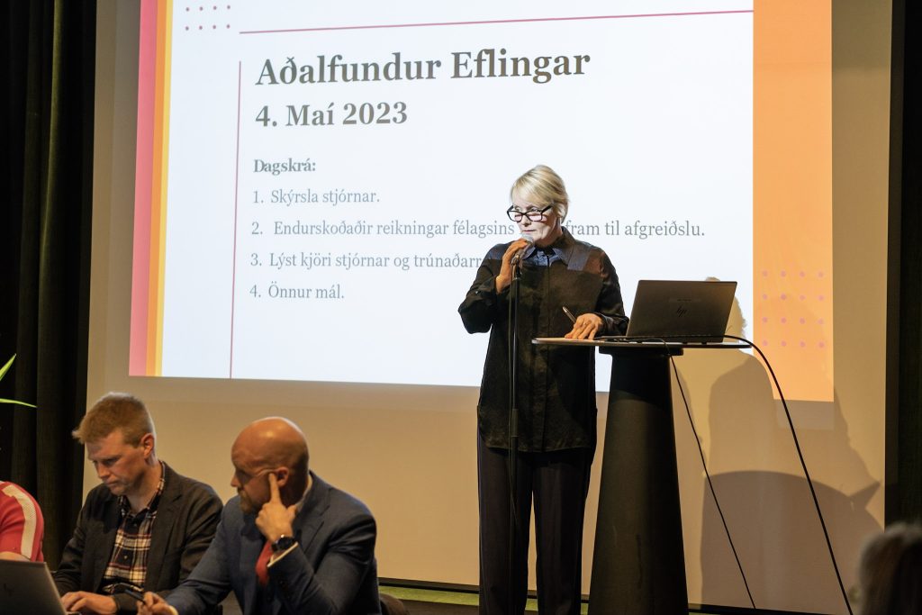 4 maja w sali Sykursal, Gróska odbyło się walne zgromadzenie związku zawodowego Efling. Spotkanie odbyło się w tradycyjnym formacie i cieszyło się dużym zainteresowaniem. Sólveig Anna, przewodnicząca związku podsumowała rok pełen wydarzeń, Perla Ösp Ásgeirsdóttir, dyrektor zarządzający przedstawiła roczne sprawozdanie finansowe za 2022 r., które zostało zatwierdzone na spotkaniu.