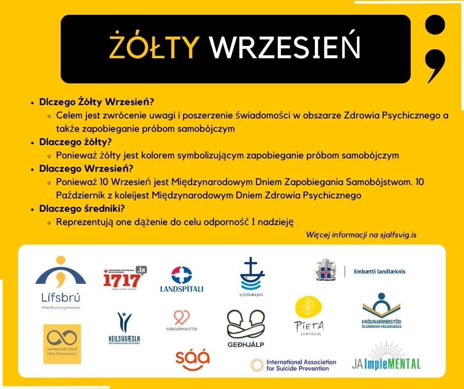 10 września okrzyknięto Dniem Żółtym. Każdego, kto ma taką możliwość, zachęcamy do założenia czegoś żółtego w tym dniu. W zeszłym roku w Islandii po raz pierwszy cały wrzesień poświęcono zdrowiu psychicznemu.