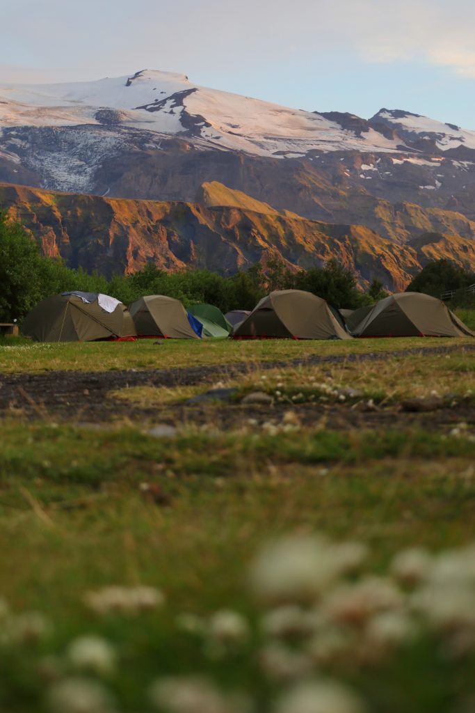 Zdjęcie islandzkiego kempingu z widokiem na góry autorstwa Agnieszki Górki