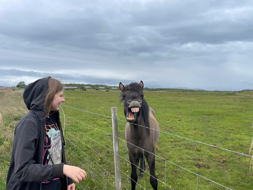 Zdjęcie śmiejącego się konia i dziewczynki autorstwa Pawła Skowrońskiego