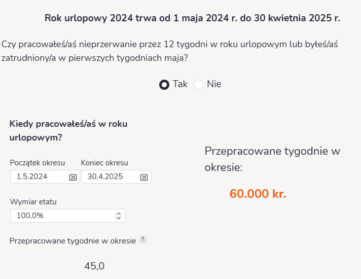 Aby obliczyć kwotę dodatku urlopowego, należy wybrać odpowiedni układ zbiorowy. Następnie użytkownik zaznacza okres przepracowany w roku urlopowym, a także wskaźnik zatrudnienia w tym okresie. Na podstawie tych informacji obliczana jest kwota, która powinna zostać wypłacona 1 czerwca.